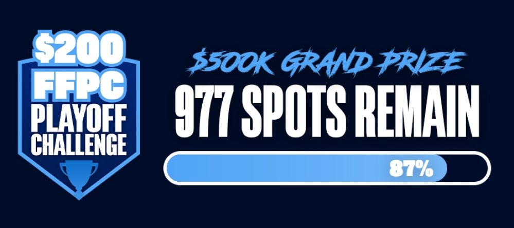 The $35 Challenge may be sold out, but there’s still a little room left in the $200 version! Only four hours remain until registration locks in the 2023-24 World Famous FFPC Playoff Challenge. Don't forget that you'll be able to apply your 2023 winnings to enter the Playoff Challenge as well. Enter for $200 to win $500,000!