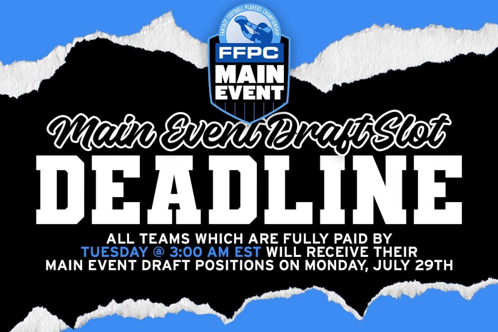 |  |  | You only have hours left to secure your early draft slots, so grab those Main Event teams now!! Pay fully for your teams by TONIGHT AT MIDNIGHT PT and receive your draft positions this Monday, July 29th. (Slow drafts receive draft positions as soon as draft is full).