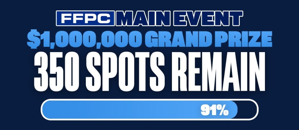 |  | The 2023 FFPC Main Event is approaching capacity, players. Don’t miss out: Draft today! In fact, we have just THREE spots left at 6pm before the Chiefs host the Lions tonight. We also have Main Event drafts scheduled for 3:30 ET this afternoon, too. Register right now here, and play the Main Event while you still can! |  | With the FantasyPros Championship only approaching 80 percent full and only THREE days of drafting left, this competition has some fantastic ROI for you! Enter the FantasyPros Championship here at just a $350 entry, and take your shot at a $1,000,0000 grand prize. Drafts resume at 10am ET this morning, and run through 1am ET tonight. |  | |