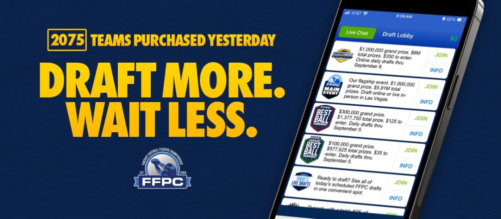 | |  |  | When we say you’ll be drafting right away when you sign up for drafts at the FFPC, we mean it! More than 2,000 teams found that out when they registered yesterday. You can come draft in any one of the Main Event drafts we have going off today and take your shot at a million-dollar grand prize. Here’s the schedule today: