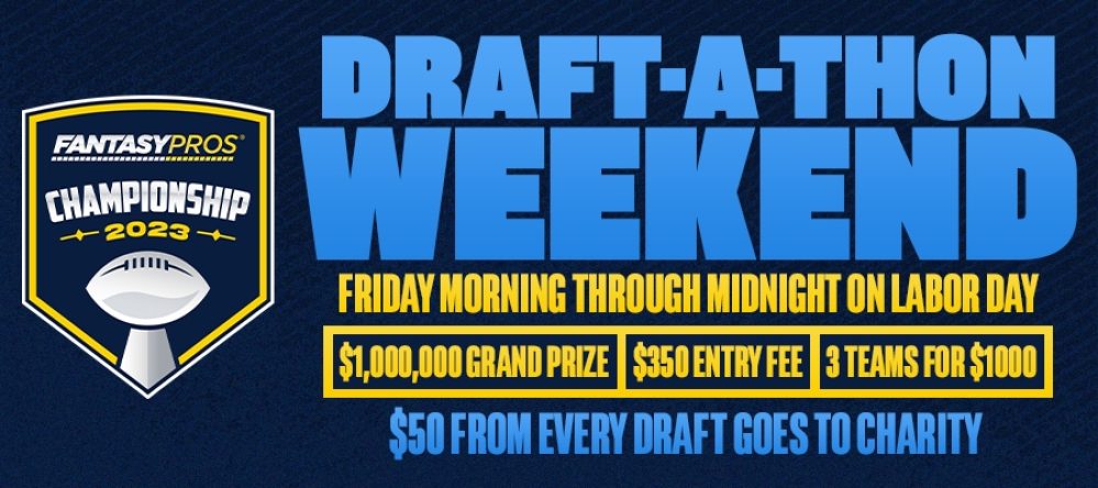 |  | The FantasyPros Championship Draft-A-Thon reaches Day Two today. This year, the FFPC and FantasyPros will donate $50 from every filled draft this weekend to the Breast Cancer Research Foundation. Spend your Saturday drafting for fantasy football glory! |  | As a reminder, the FantasyPros Championship is a little over two-thirds full. With only EIGHT days of drafting left and just under 7,000 teams to go, this competition has some fantastic ROI for you! Enter the FantasyPros Championship here at just a $350 entry, and take your shot at a $1,000,0000 grand prize. |  | Time is running out! Take your shot at a $1,000,000 grand prize in the Main Event, players. Enter the competition here and become a millionaire thanks to your fantasy football chops. |  | | |  | |